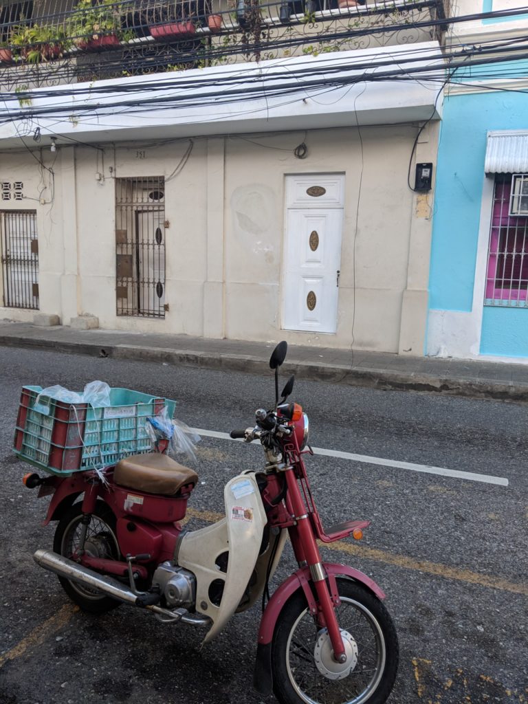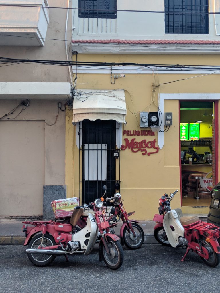 Diferentes motonetas Honda en Sto Domingo, zona colonial. Caminando nos sentimos muy en Havana, Cuba. La gente habla muy igual, las mañas muy iguales y la arquitectura muy igual. Pero Havana esta mas decaída que Sto Domingo. En la plaza España en depto de turismo pone música en vivo todos los viernes y sábados.