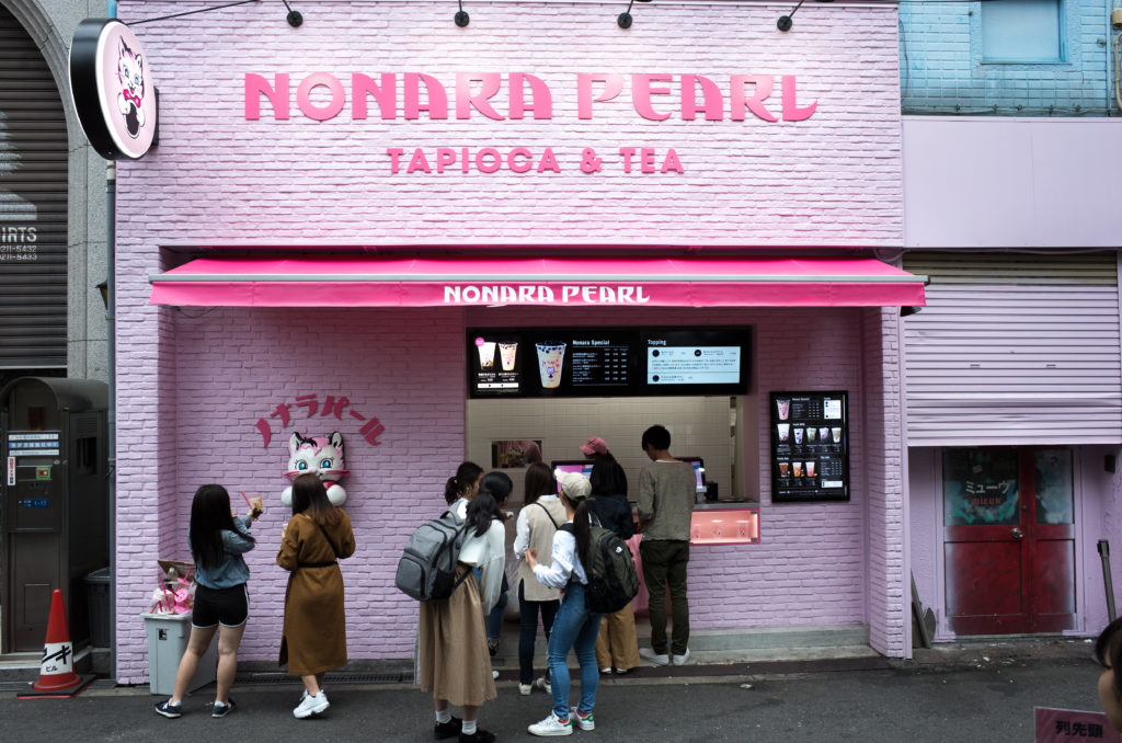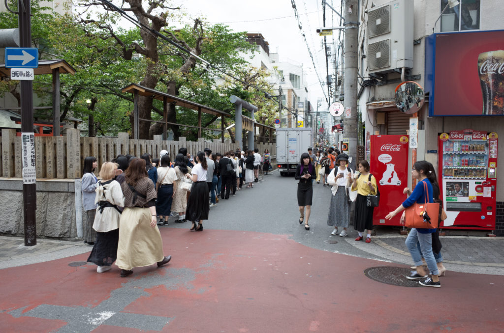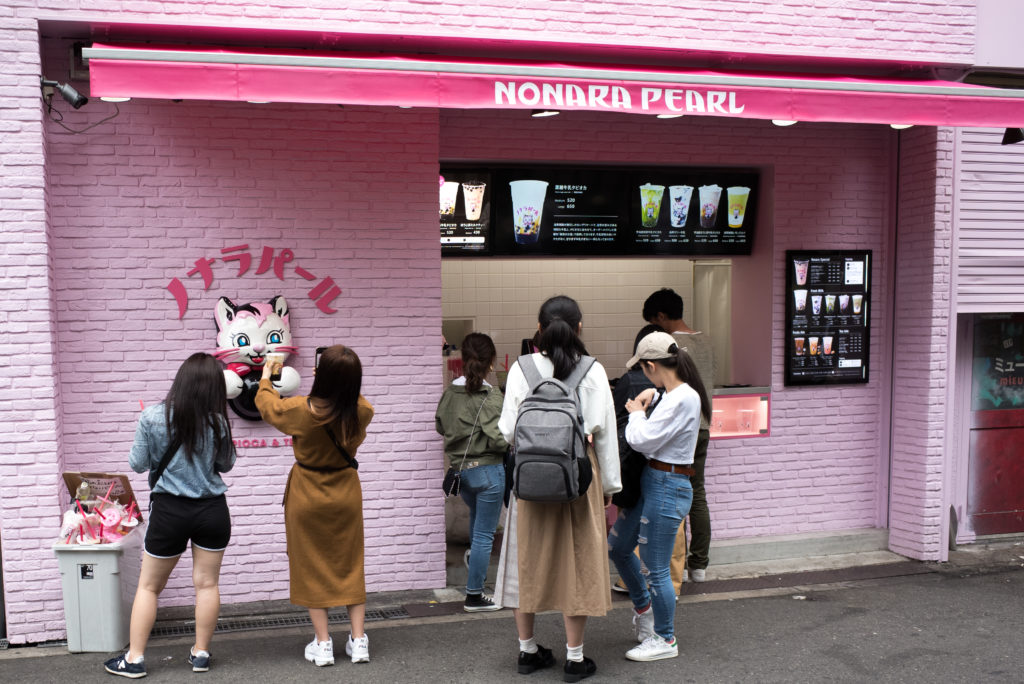 A pink brick facade with bold pink lettering and a neon pink sign of a cute pink kitten with a bow-tie holding a black ball. Most if not all of the people in queue are women, in their teens to late 20’s. They take selfies for social media in anticipation of their purchase. One girl is slowly eating a huge corn dog slathered in mustard and mayonnaise. High pitch voices, giggles and laughter fill the air. There’s no K-pop stars around, they’re not going into the shrine for praying, no priests for confessions.