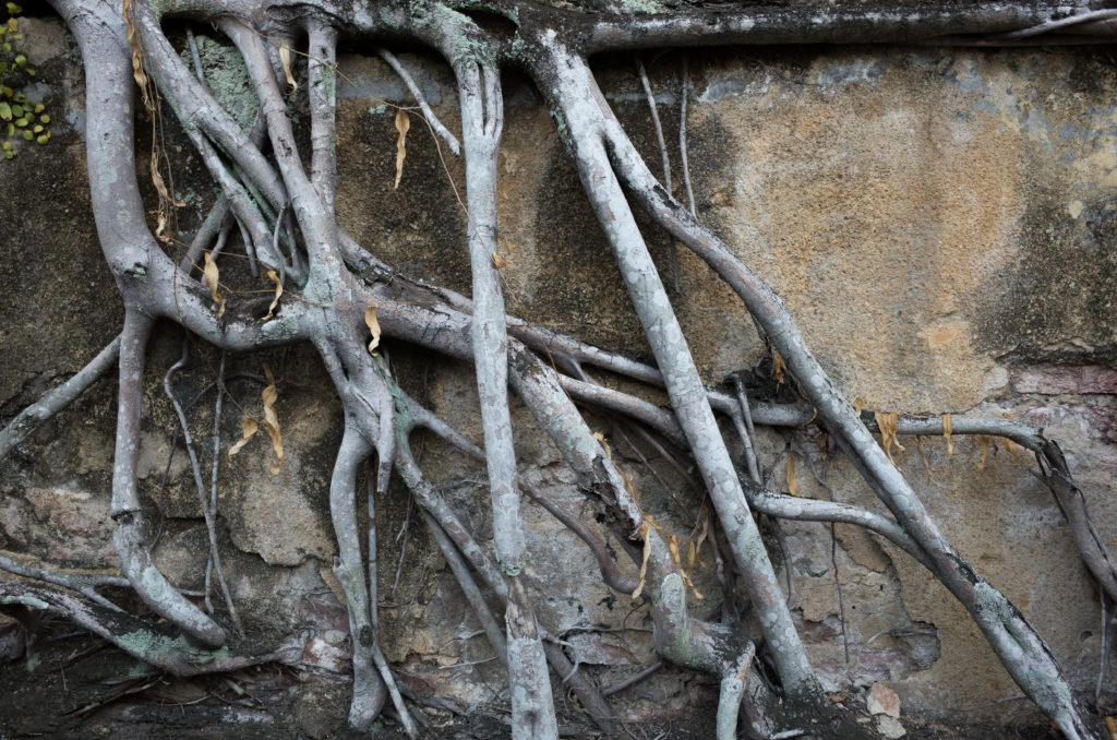 Some roots on the side of a wall, walking past a Muslim cemetery in Singapore.